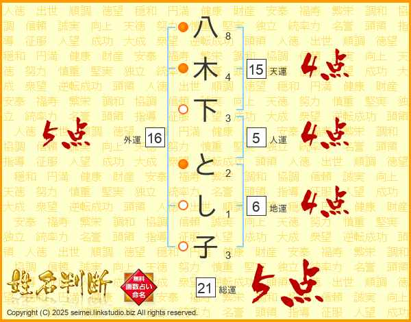 生活面を象徴する運勢です。外部から受ける影響力を表し、結婚運、家庭運や職場、環境への順応性を表します。総運から人運を引いた画数。姓や名が1文字の場合を除く。