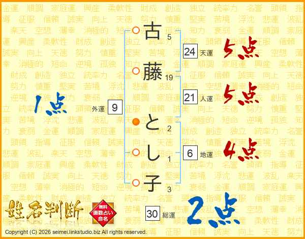 古(5画)藤(19画) と(2画)し(1画)子(3画)