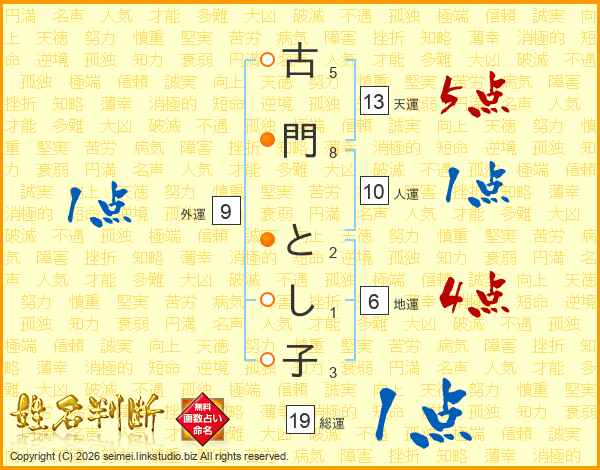 古(5画)門(8画) と(2画)し(1画)子(3画)