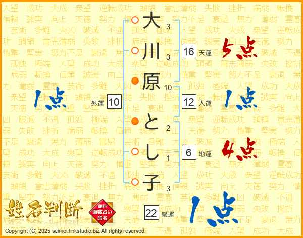 生活面を象徴する運勢です。外部から受ける影響力を表し、結婚運、家庭運や職場、環境への順応性を表します。総運から人運を引いた画数。姓や名が1文字の場合を除く。