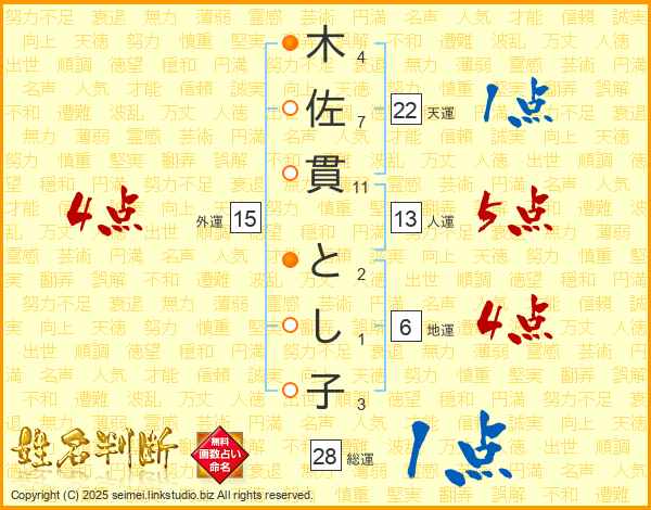 木(4画)佐(7画)貫(11画) と(2画)し(1画)子(3画)