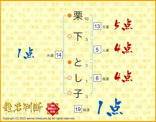 生活面を象徴する運勢です。外部から受ける影響力を表し、結婚運、家庭運や職場、環境への順応性を表します。総運から人運を引いた画数。姓や名が1文字の場合を除く。
