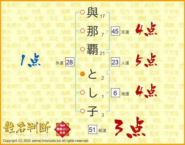 與(17画)那(7画)覇(21画) と(2画)し(1画)子(3画)