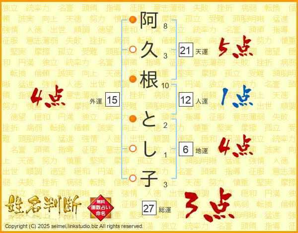 阿(8画)久(3画)根(10画) と(2画)し(1画)子(3画)