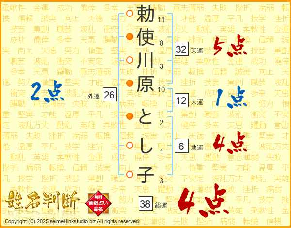 勅使川原とし子さんの総運は38画の4点