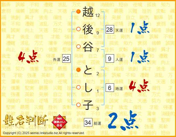 越(12画)後(9画)谷(7画) と(2画)し(1画)子(3画)