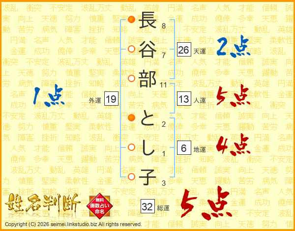 生活面を象徴する運勢です。外部から受ける影響力を表し、結婚運、家庭運や職場、環境への順応性を表します。総運から人運を引いた画数。姓や名が1文字の場合を除く。