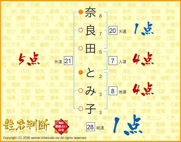 奈(8画)良(7画)田(5画) と(2画)み(3画)子(3画)