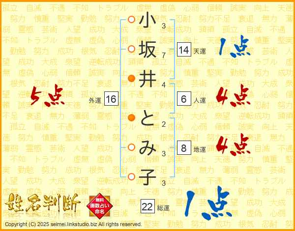 小(3画)坂(7画)井(4画) と(2画)み(3画)子(3画)