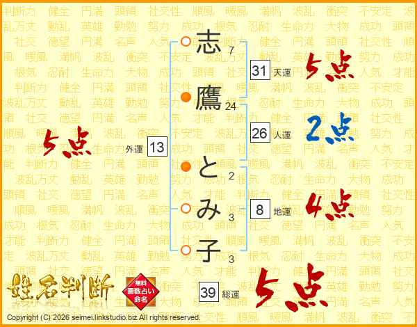 志(7画)鷹(24画) と(2画)み(3画)子(3画)