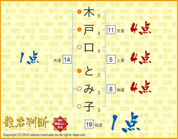木(4画)戸(4画)口(3画) と(2画)み(3画)子(3画)