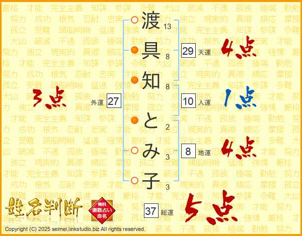 渡(13画)具(8画)知(8画) と(2画)み(3画)子(3画)