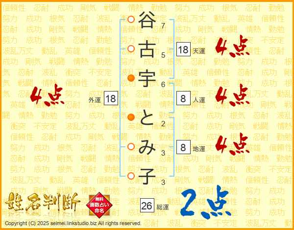 谷(7画)古(5画)宇(6画) と(2画)み(3画)子(3画)