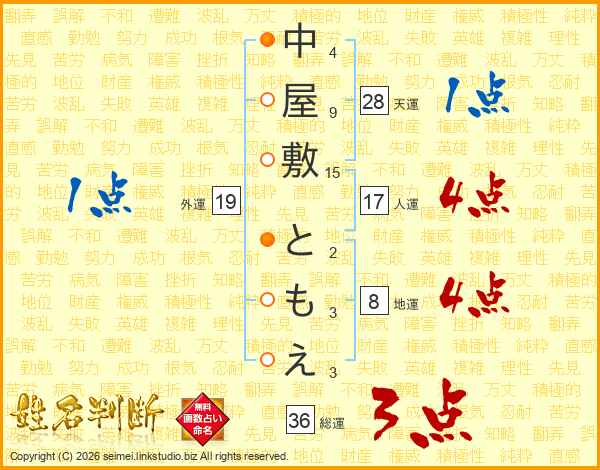 生活面を象徴する運勢です。外部から受ける影響力を表し、結婚運、家庭運や職場、環境への順応性を表します。総運から人運を引いた画数。姓や名が1文字の場合を除く。