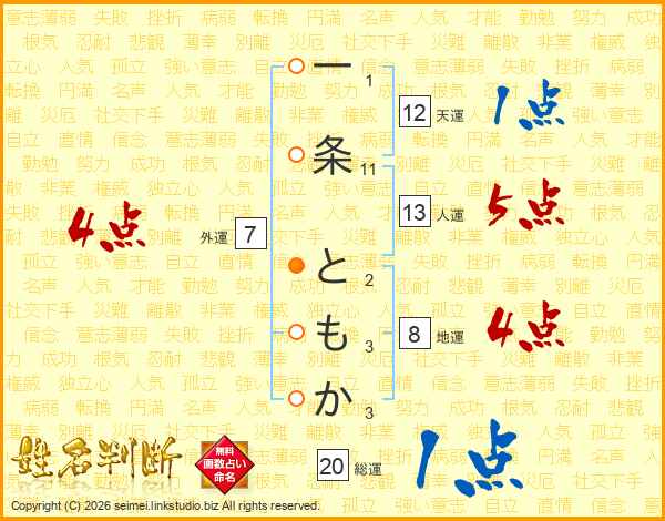 あなたの人生を表す1番重要な運勢です。生涯を通じて影響する総合運となり、主に50歳以降の晩年期に影響を及ぼします。苗字と名前の合計画数。