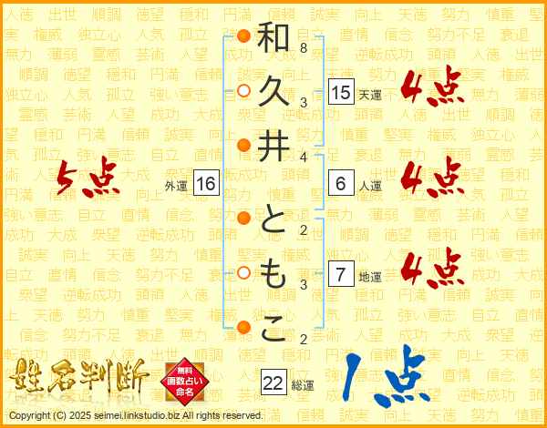 和久井ともこさんの総運は22画の1点!
