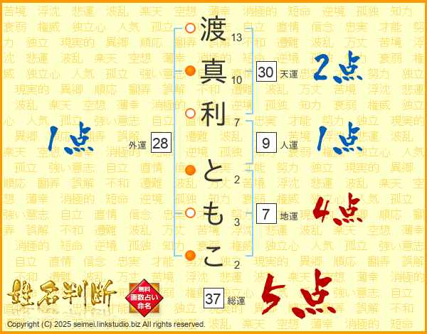 渡(13画)真(10画)利(7画) と(2画)も(3画)こ(2画)