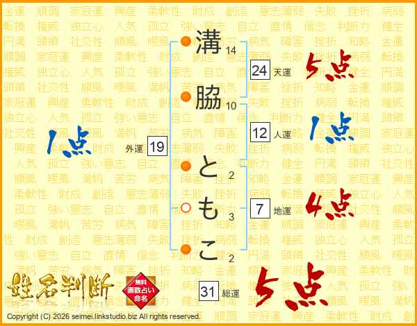生活面を象徴する運勢です。外部から受ける影響力を表し、結婚運、家庭運や職場、環境への順応性を表します。総運から人運を引いた画数。姓や名が1文字の場合を除く。
