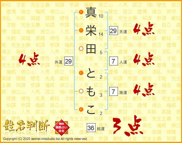 真(10画)栄(14画)田(5画) と(2画)も(3画)こ(2画)