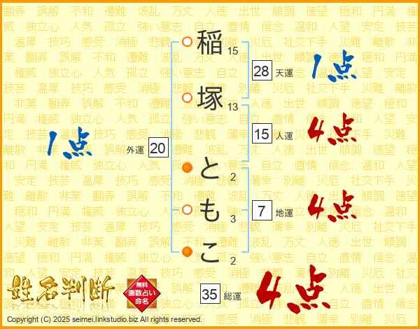 稲(15画)塚(13画) と(2画)も(3画)こ(2画)