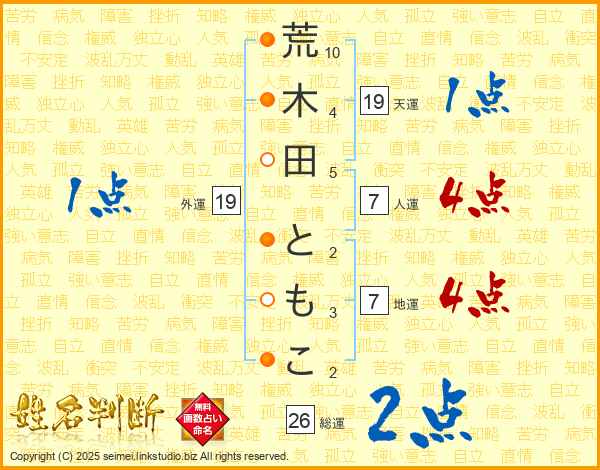荒(10画)木(4画)田(5画) と(2画)も(3画)こ(2画)