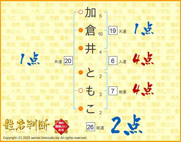 生活面を象徴する運勢です。外部から受ける影響力を表し、結婚運、家庭運や職場、環境への順応性を表します。総運から人運を引いた画数。姓や名が1文字の場合を除く。