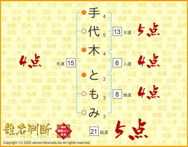 手(4画)代(5画)木(4画) と(2画)も(3画)み(3画)