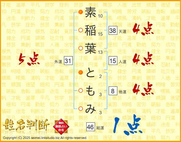 生活面を象徴する運勢です。外部から受ける影響力を表し、結婚運、家庭運や職場、環境への順応性を表します。総運から人運を引いた画数。姓や名が1文字の場合を除く。