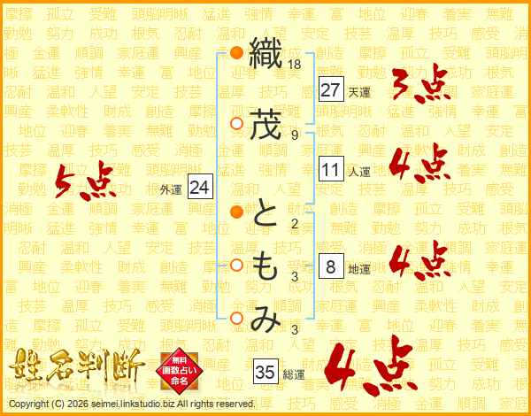 織(18画)茂(9画) と(2画)も(3画)み(3画)
