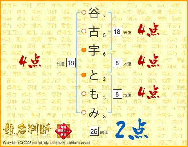 生活面を象徴する運勢です。外部から受ける影響力を表し、結婚運、家庭運や職場、環境への順応性を表します。総運から人運を引いた画数。姓や名が1文字の場合を除く。