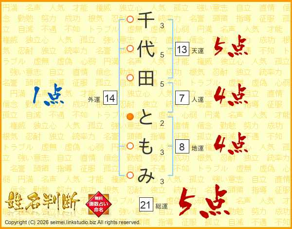 千代田ともみさんの総運は21画の5点!