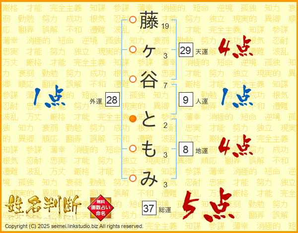 藤ヶ谷ともみさんの総運は37画の5点!