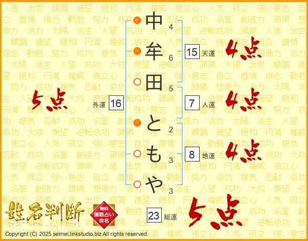 中(4画)牟(6画)田(5画) と(2画)も(3画)や(3画)