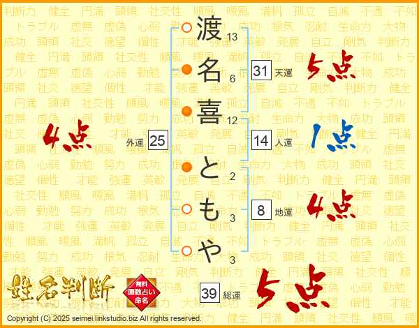 渡(13画)名(6画)喜(12画) と(2画)も(3画)や(3画)