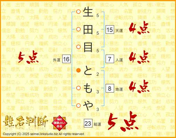 生(5画)田(5画)目(5画) と(2画)も(3画)や(3画)