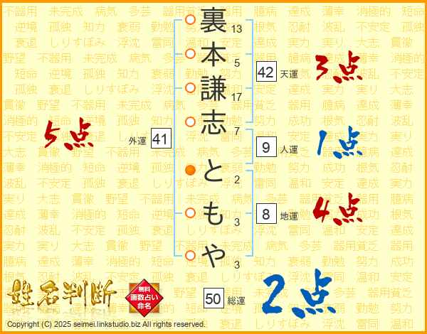 裏本謙志ともやさんの総運は50画の2点!
