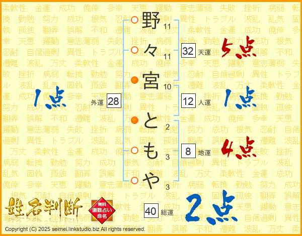 生活面を象徴する運勢です。外部から受ける影響力を表し、結婚運、家庭運や職場、環境への順応性を表します。総運から人運を引いた画数。姓や名が1文字の場合を除く。