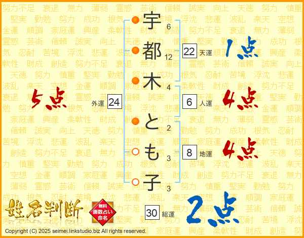 宇(6画)都(12画)木(4画) と(2画)も(3画)子(3画)
