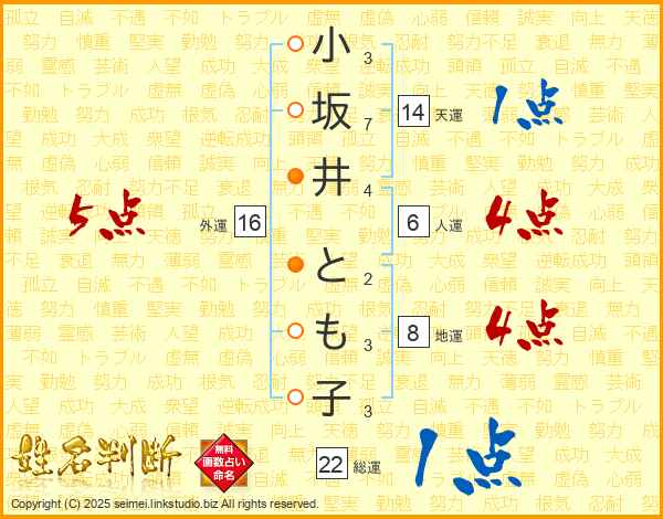 小(3画)坂(7画)井(4画) と(2画)も(3画)子(3画)