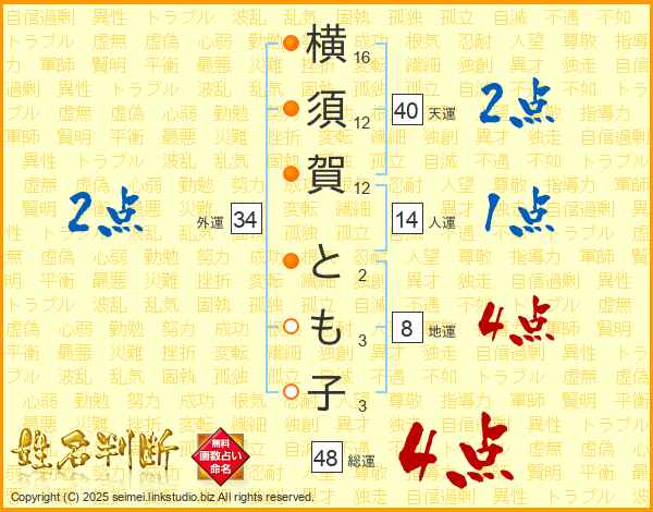 横(16画)須(12画)賀(12画) と(2画)も(3画)子(3画)