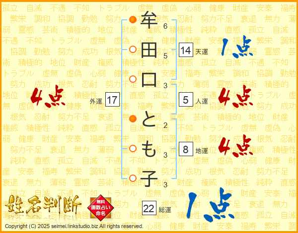 生活面を象徴する運勢です。外部から受ける影響力を表し、結婚運、家庭運や職場、環境への順応性を表します。総運から人運を引いた画数。姓や名が1文字の場合を除く。
