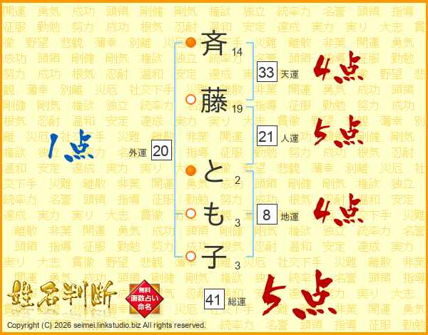 斉(14画)藤(19画) と(2画)も(3画)子(3画)