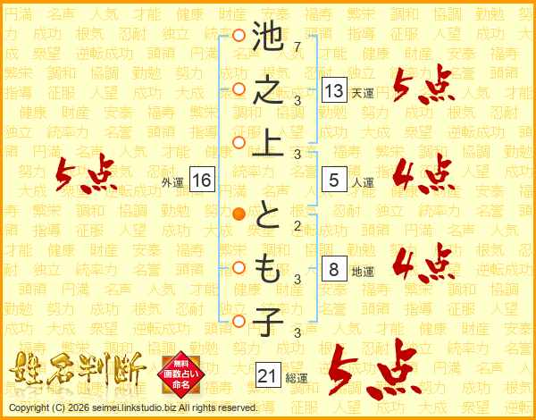 生活面を象徴する運勢です。外部から受ける影響力を表し、結婚運、家庭運や職場、環境への順応性を表します。総運から人運を引いた画数。姓や名が1文字の場合を除く。