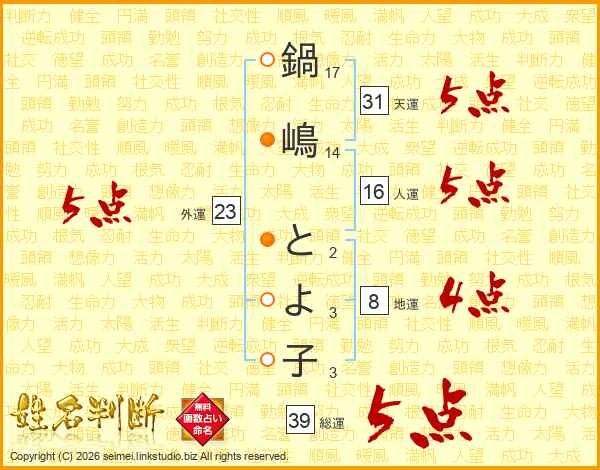 鍋(17画)嶋(14画) と(2画)よ(3画)子(3画)