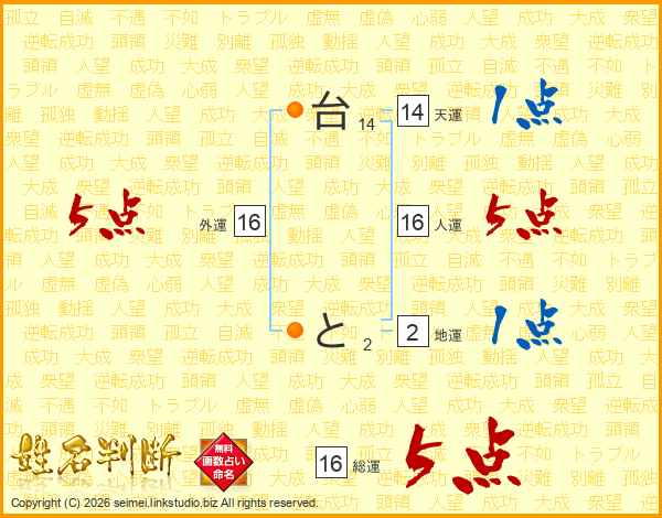 生活面を象徴する運勢です。外部から受ける影響力を表し、結婚運、家庭運や職場、環境への順応性を表します。総運から人運を引いた画数。姓や名が1文字の場合を除く。