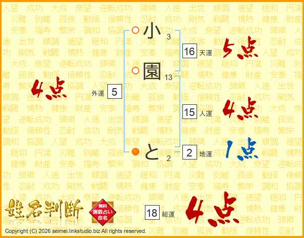 生活面を象徴する運勢です。外部から受ける影響力を表し、結婚運、家庭運や職場、環境への順応性を表します。総運から人運を引いた画数。姓や名が1文字の場合を除く。