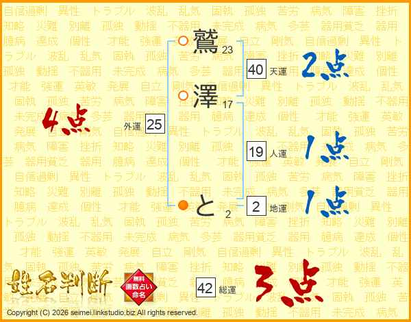 生活面を象徴する運勢です。外部から受ける影響力を表し、結婚運、家庭運や職場、環境への順応性を表します。総運から人運を引いた画数。姓や名が1文字の場合を除く。