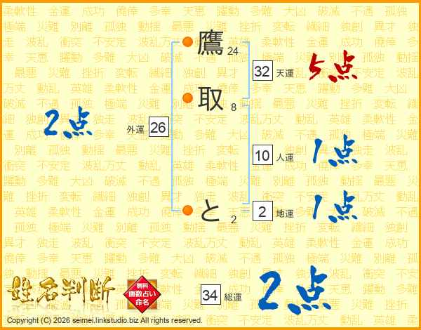 鷹取とさんの総運は34画の2点!