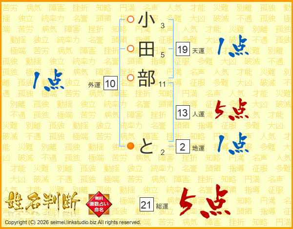 生活面を象徴する運勢です。外部から受ける影響力を表し、結婚運、家庭運や職場、環境への順応性を表します。総運から人運を引いた画数。姓や名が1文字の場合を除く。