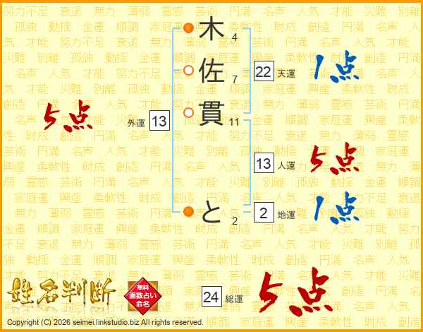 あなたの人生を表す1番重要な運勢です。生涯を通じて影響する総合運となり、主に50歳以降の晩年期に影響を及ぼします。苗字と名前の合計画数。